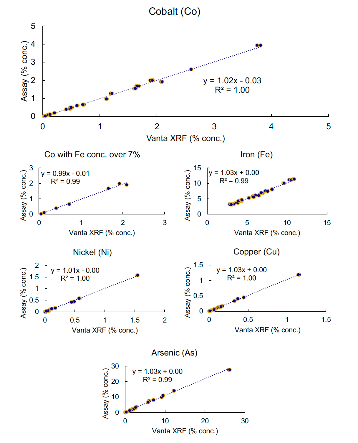 Vanta X射線熒光分析儀得出的數據與實驗室數據在鈷(Co)含量方面顯示出卓越的相關性,即使在濃度低于0.05%且鐵(Fe)含量超過10%的情況下也是如此。砷(As)、鎳(Ni)和銅(Cu)的數據也與實驗室數值相比展現了極高的準確性。