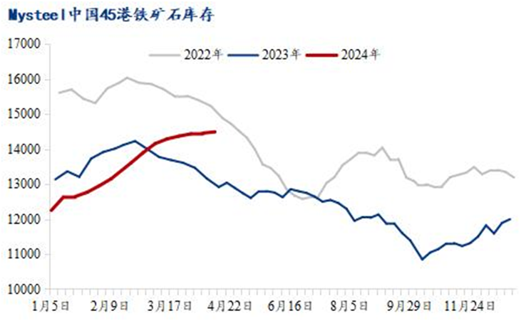 港口庫(kù)存方面,4月15日,中國(guó)45港進(jìn)口鐵礦石庫(kù)存總量14656.54萬噸,環(huán)比上周一增加190萬噸,47港庫(kù)存總量15296.54萬噸,環(huán)比增加245萬噸。目前累庫(kù)有所放緩,五一節(jié)前鋼廠補(bǔ)庫(kù)力度,廠內(nèi)庫(kù)存或小幅增加,后續(xù)在疏港增加之下,港口庫(kù)存或逐步迎來庫(kù)存拐點(diǎn),但4月份仍難降庫(kù)。