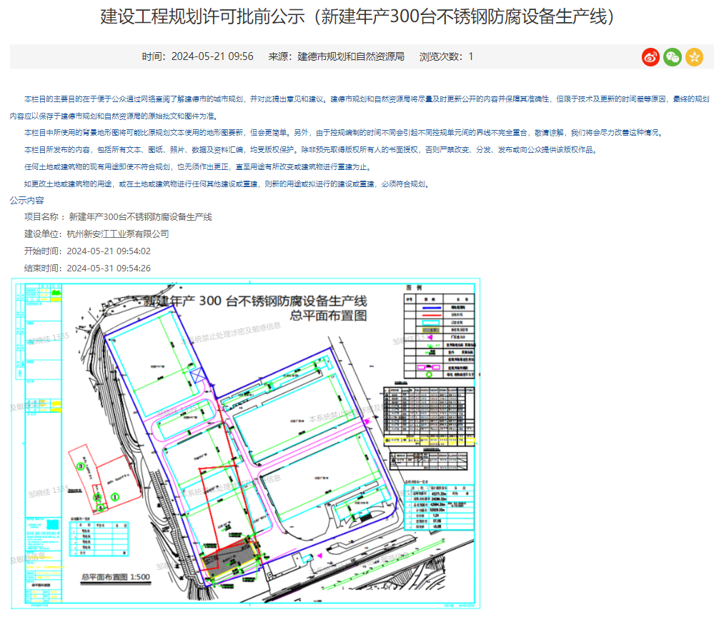 建德市人民政府消息,5月21日,建德市規劃和自然資源局就杭州新安江工業泵有限公司新建年產300臺不銹鋼防腐設備生產線建設工程規劃許可進行批前公示,公示期:5月21-31日。