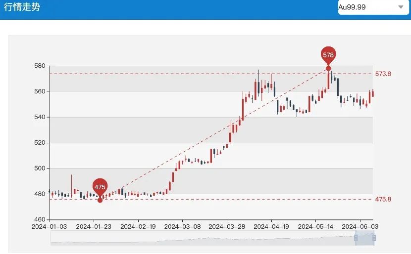 拉長時間看,盡管近期現貨黃金價格有所回落,但年初至6月7日漲幅仍超11%。國內金價亦不斷攀升,上海黃金交易所AU9999年內最高觸及578元/克,較年初低點475元/克漲幅達21.68%。