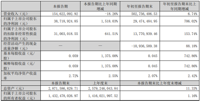 近日,云南鍺業發布財報,今年前三季度,公司實現營業收入5.03億元,同比增長6.74%;歸屬于上市公司股東的凈利潤2947.45萬元,同比增長706.02%。
