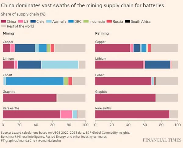 中國在幾種制造電池的關鍵礦產供應鏈中占據主導地位,深紅色部分代表中國,從上至下列出的礦產分別為銅、鋰、鈷、石墨和稀土。