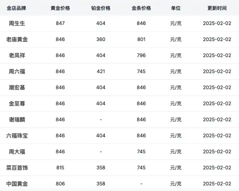 國內(nèi)零售端品牌足金飾品的價(jià)格同樣水漲船高。2月2日,國內(nèi)黃金珠寶品牌足金首飾價(jià)格最高已突破847元/克。