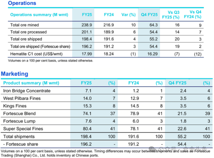 7月24日,澳大利亞礦業公司福德士河發布2025年第二季度(2025澳大利亞財年Q4)運營報告,報告顯示: