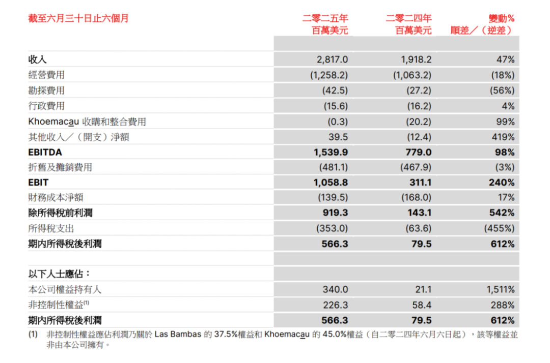 8月12日晚間,五礦資源披露半年業績,2025年上半年,五礦資源實現收入28.17億美元,同比增長47%;除稅后利潤達5.663億美元,與上年同期的0.795億美元相比,實現了612%增長;公司權益持有人應占利潤3.40億美元,與上年同期的0.211億美元相比,實現了超過15倍的增長。