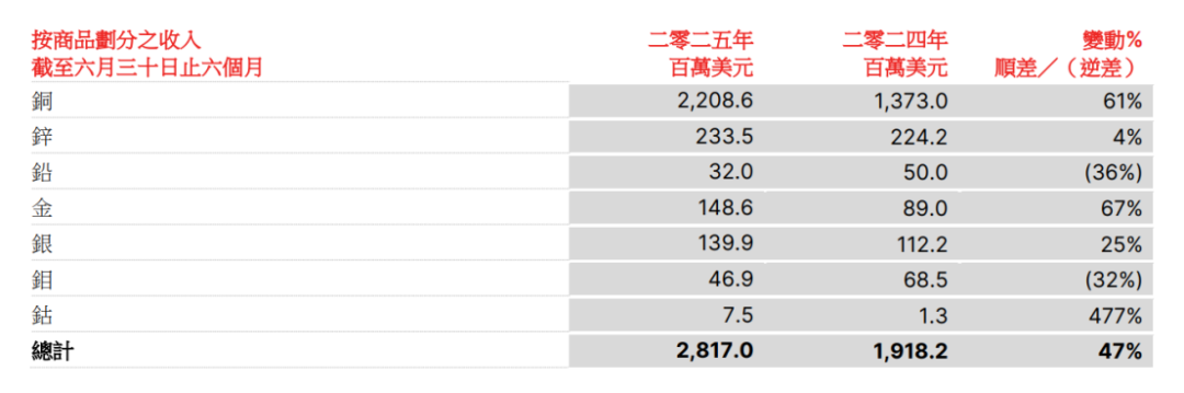 2025年上半年,倫敦金屬交易所(LME)金、銀、鈷等金屬價格分別上漲39%、26%、7%,也帶動五礦資源相關板塊營收的增長。當然,五礦資源業績的“爆發”主要得益于銅板塊的量價齊升!