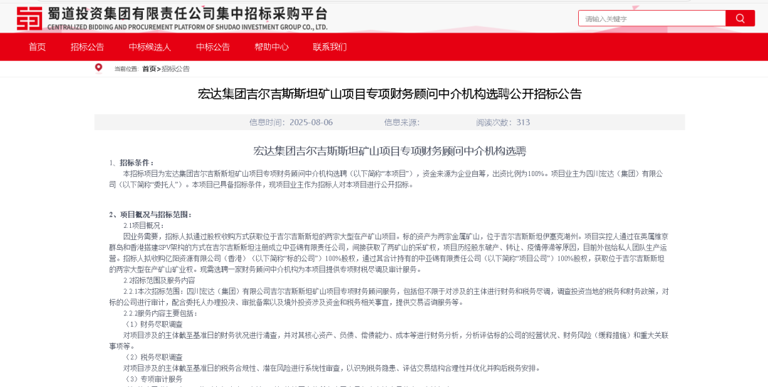 消息源于蜀道投資集團集中招標采購平臺發布的《宏達集團吉爾吉斯斯坦礦山項目專項財務顧問中介機構選聘公開招標公告》。公告顯示,宏達集團計劃收購億陽資源有限公司 (香港) 100% 股權,通過這一操作,將間接掌控中亞錫有限責任公司100% 股權,進而獲取位于吉爾吉斯斯坦伊塞克湖州的兩宗大型在產礦山礦業權。為順利推進收購,宏達集團正在公開選聘一家財務顧問中介機構,為項目提供專項財稅盡調及審計服務,項目資金全部來源于企業自籌。