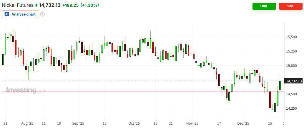 周五(12月19日)歐洲時(shí)段,倫敦金屬交易所(LME)期鎳價(jià)格漲約1.3%,報(bào)每噸14732美元。周三時(shí),鎳價(jià)一度跌破14200美元,創(chuàng)今年4月以來的最低水平。